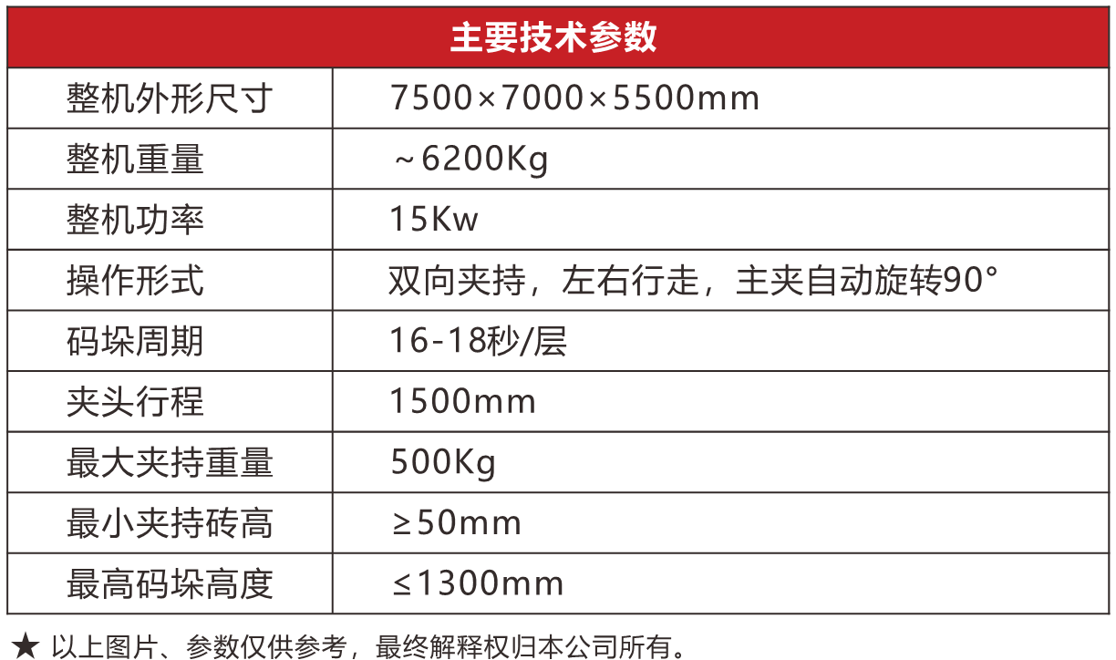 可本機適用于磚機托板上生產(chǎn)制品合并后尺寸接近于正方形的將其進行磚板分離碼垛,碼好后用叉車整垛運到堆場養(yǎng)護,也可配合叉車抱夾實現(xiàn)無托盤碼垛并可直接抱磚裝車,大大節(jié)省了人工成本。