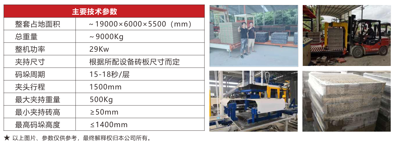 整套系統(tǒng)采用PLC+觸摸屏控制,配合智能傳感器,實現(xiàn)無人自動化運行,出現(xiàn)故障自動停機報警并顯示故障位 置,無需專業(yè)技術(shù)人員就可輕松排除故障,設(shè)備運行采用電、氣、液分別控制,互不干擾、動作連貫,約16s左右可碼 一層,班碼磚量約2000板,配套叉車抱夾可實現(xiàn)無托盤轉(zhuǎn)運,裝車。